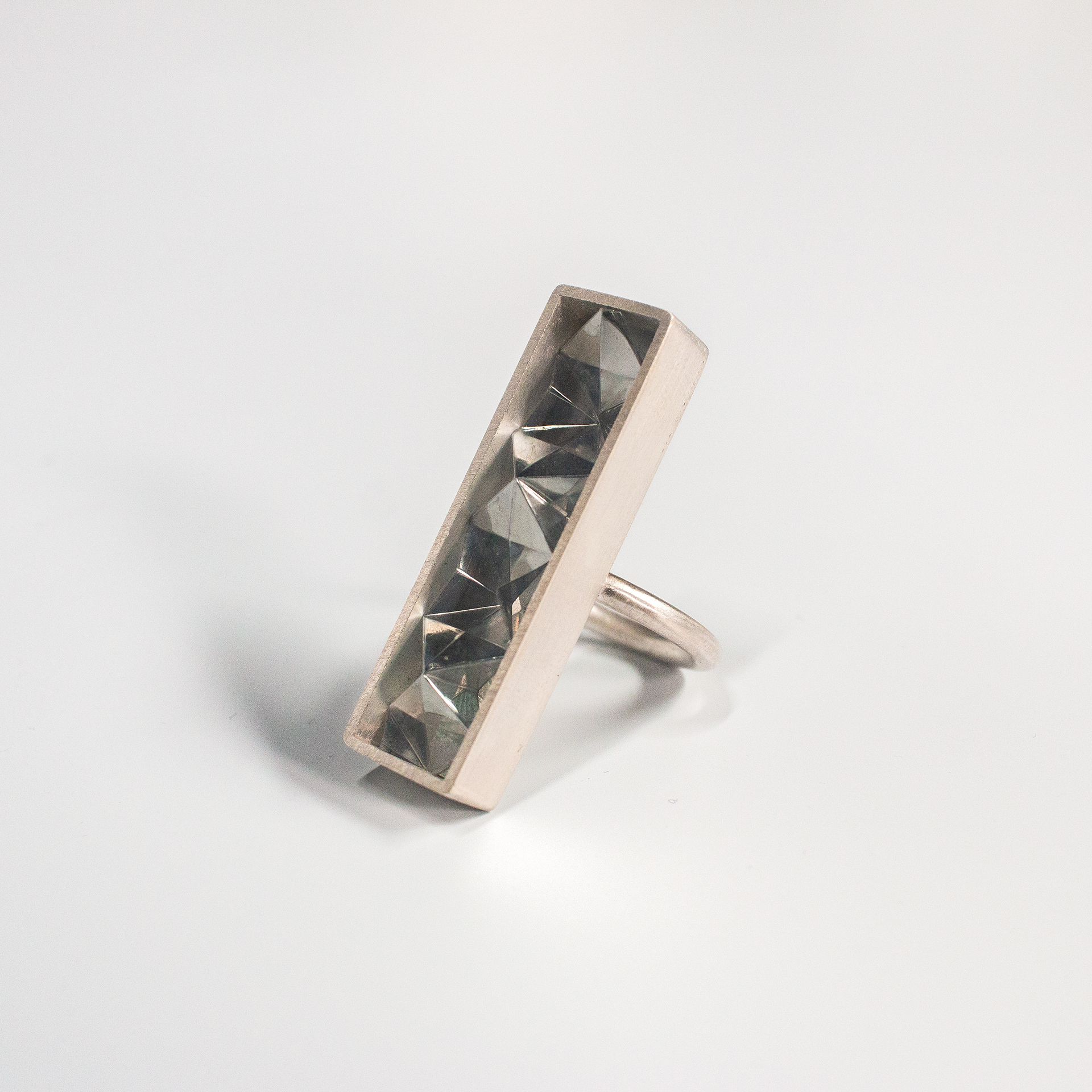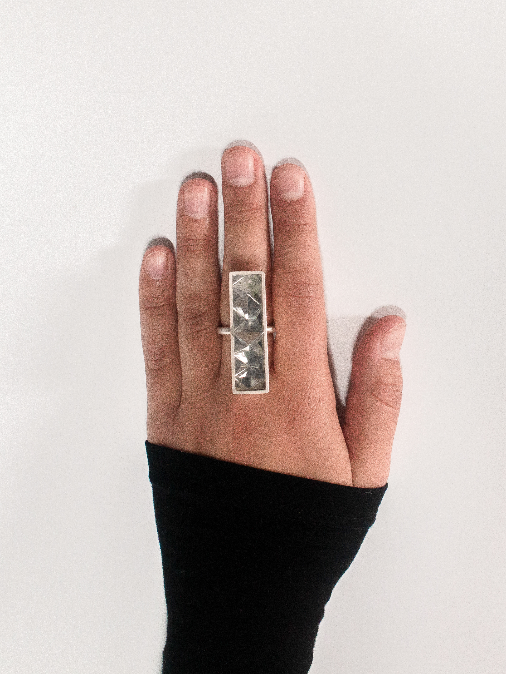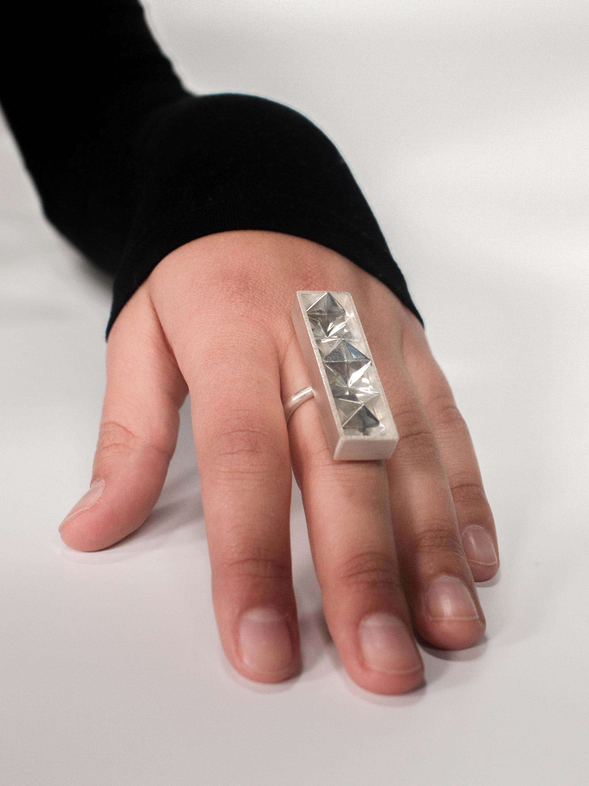 From the outset, the goal was to move away from traditional ring forms and create a piece that draws attention to the entire hand. After initial sketches and paper prototypes, I developed a bold, angular design language that proved ideal for enhancing the foil’s reflective properties.