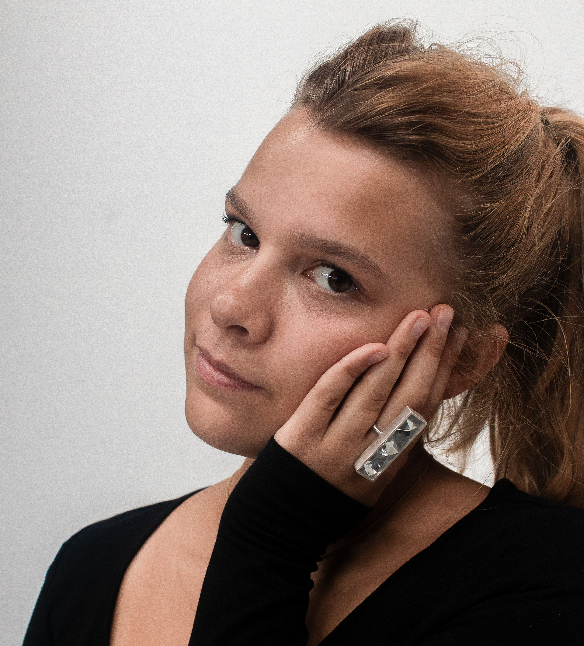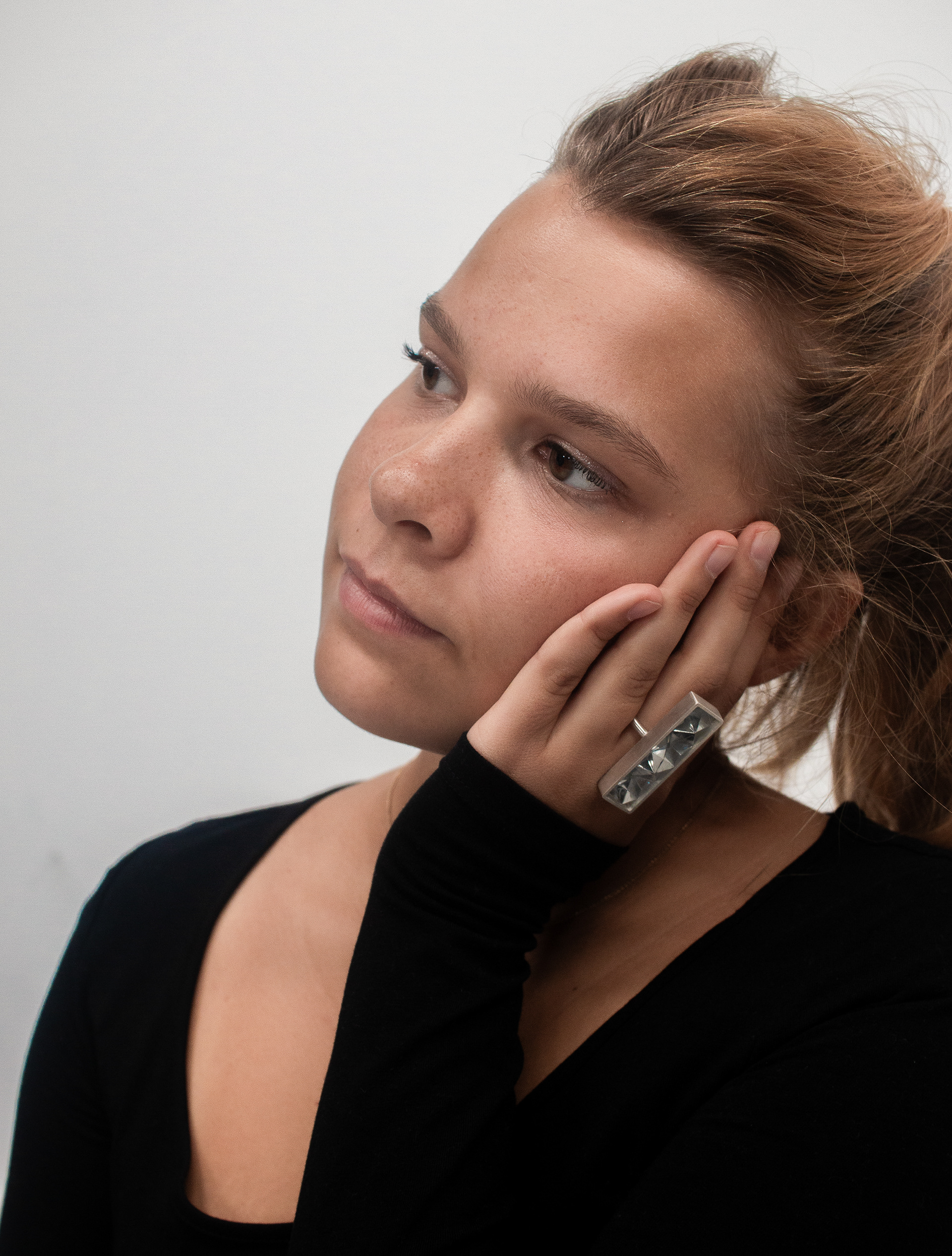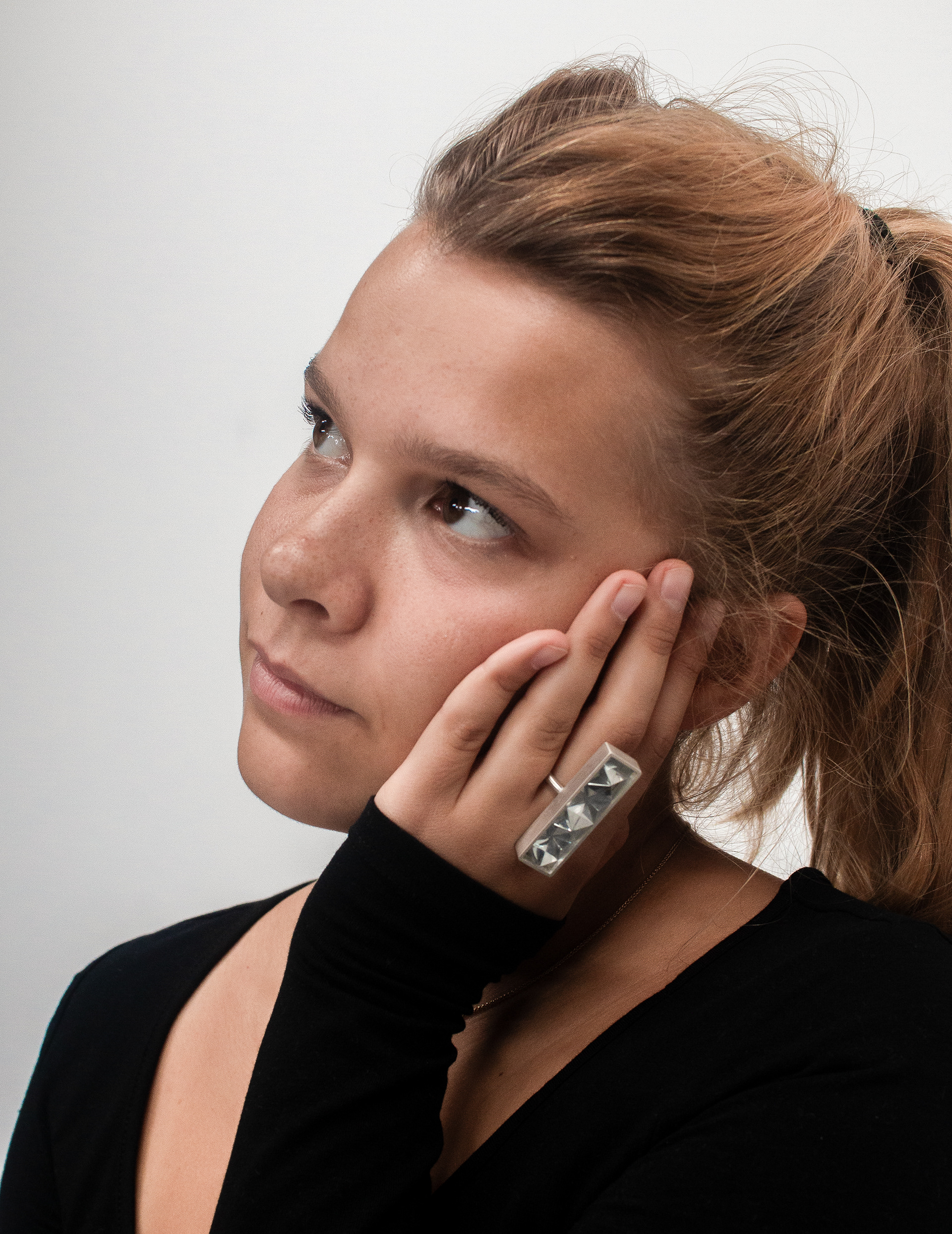 From the outset, the goal was to move away from traditional ring forms and create a piece that draws attention to the entire hand. After initial sketches and paper prototypes, I developed a bold, angular design language that proved ideal for enhancing the foil’s reflective properties.