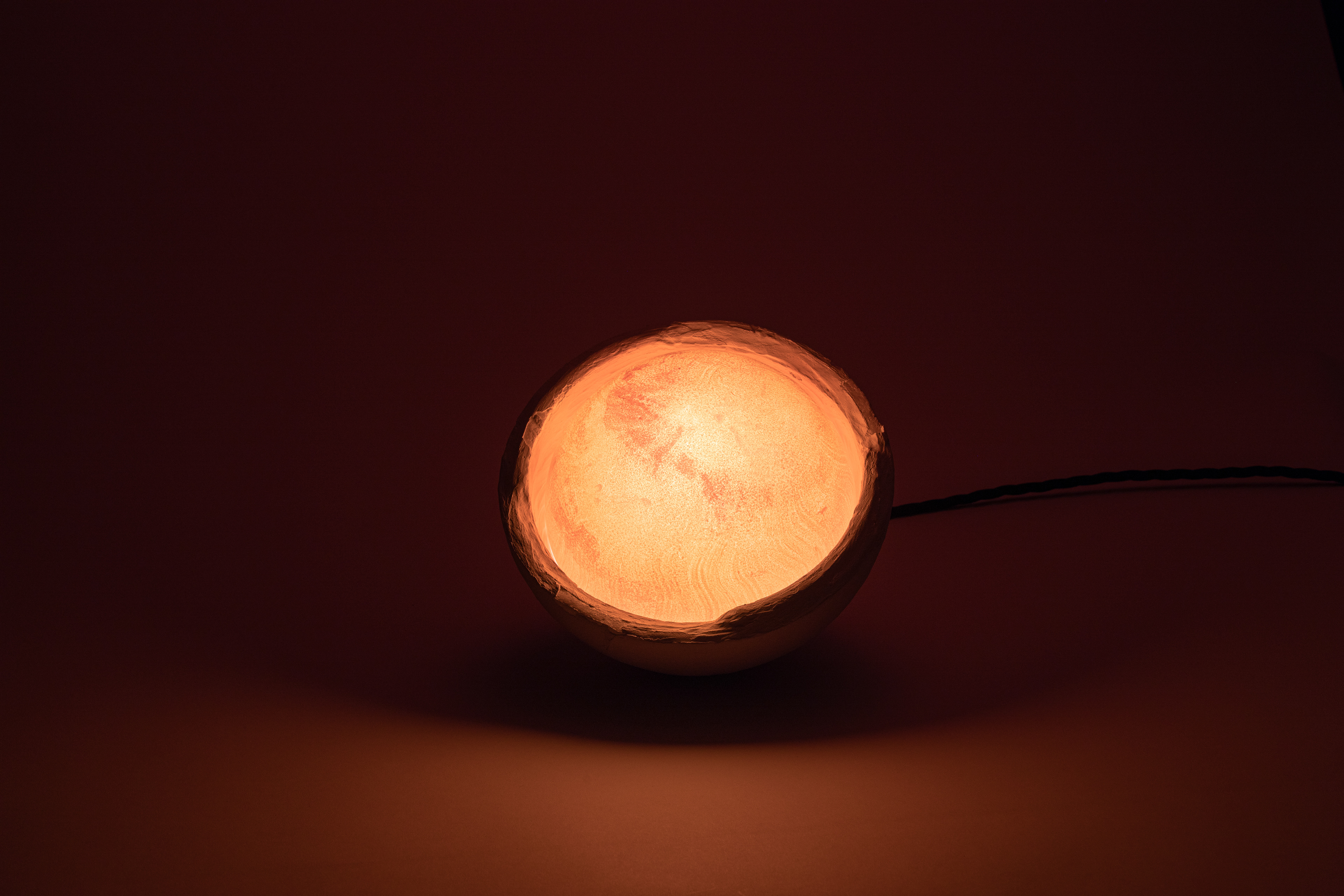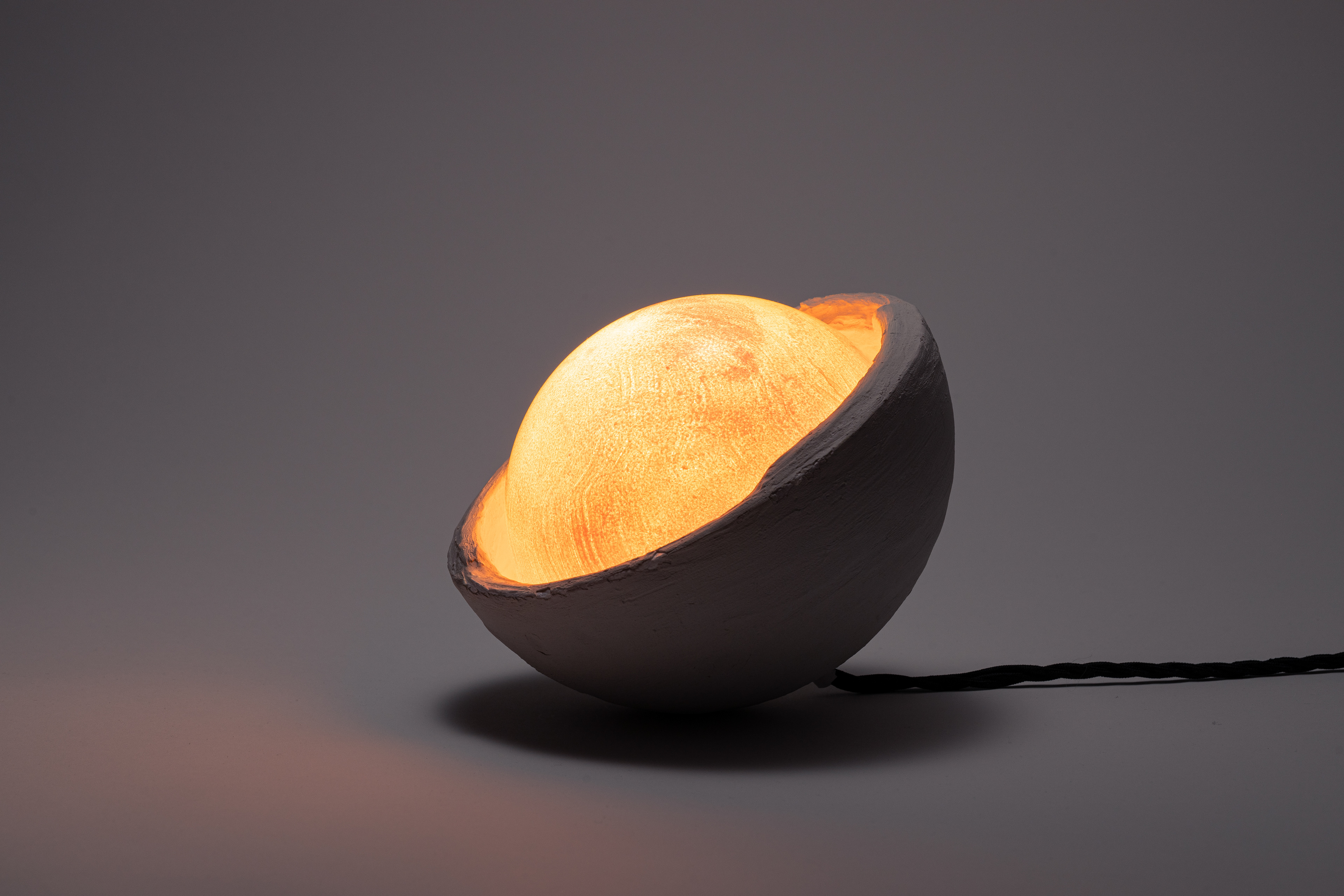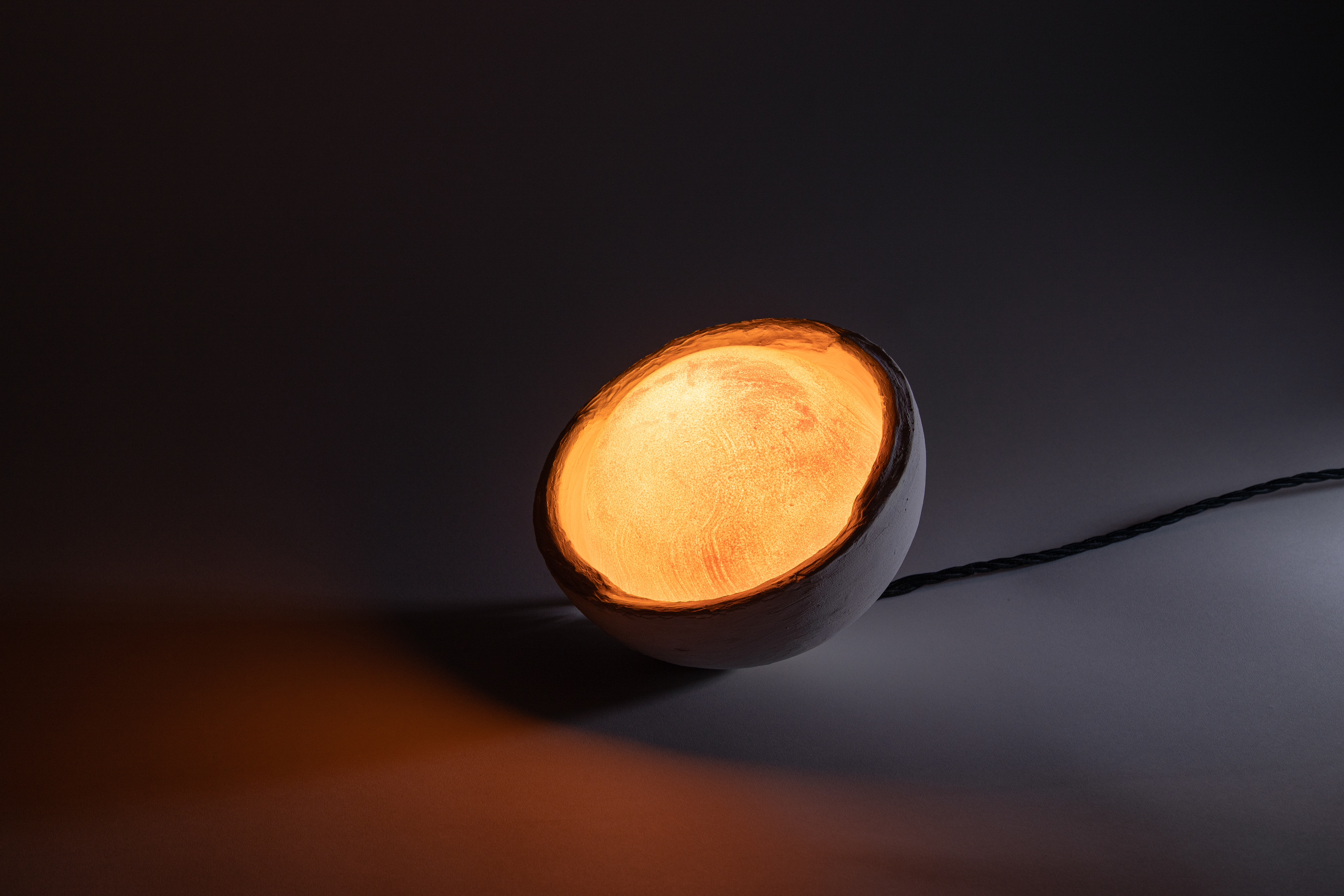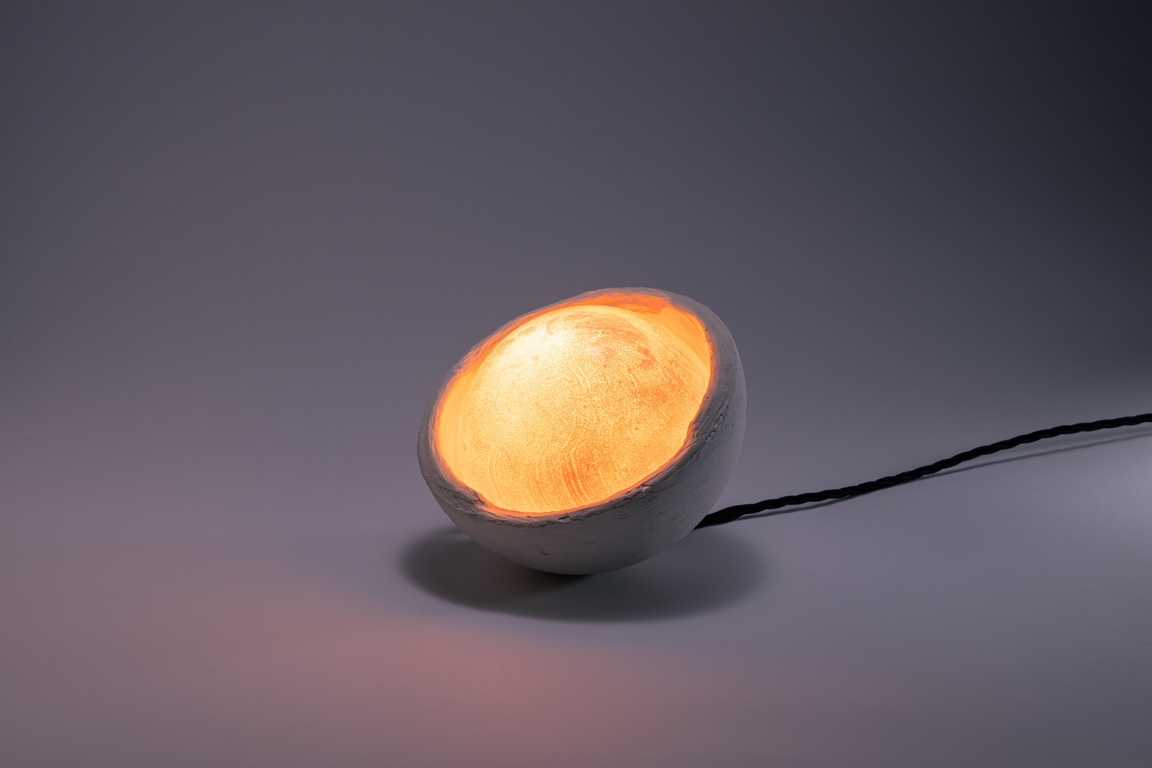 What is incubating here? Incubation is a lamp that combines organic warmth, intimacy, and the fantastic. The hemispherical glass form, painted in warm red and orange tones on the inside, is reminiscent of a belly cavity, skin, or an inner, living space. Embedded in a white concrete shell, a harmonious tension arises between the smooth, cool outer shell and the lively, organic inner world. With Incubation, I want to explore the relationship between interior and exterior space, materiality and physicality. The project combines sensual experience and visual aesthetics.